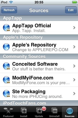 First, add http://applerepo.com/ as a new “Source” for your Installer. Do this by going to installer (See how to Jailbreak post if you don't have this), and clicking on 'Sources' in the bottom right hand corner. You will get this screen:
