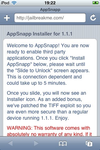 Read what it says and then scroll to the bottom, where there is a button that says 'Install AppSnap'. Click this and WAIT. Safari will close. Keep waiting until you see the 'Slide To Unlock' Screen. If you see a new icon called 'Installer', It has worked. (Comment if it didn't).